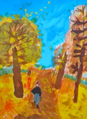 В нашем районе есть очень красивое место – Терлецкий парк, в нём растут большие, высокие дубы. В своей работе я нарисовал себя, гуляющего по парку осенью.