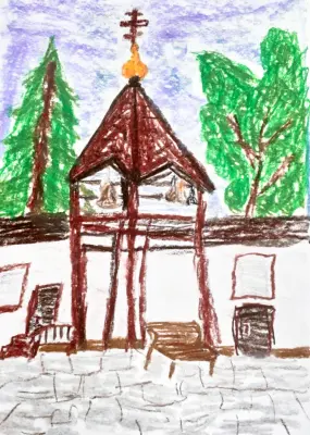 Эту колокольню я рисовала на территории Спасского храма. Она расположена рядом с храмом. Храм очень красивый и старинный. Он находится в нашем районе и недалеко от моего дома.