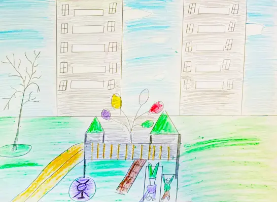 Я люблю свой благоустроенный двор, где есть места для занятия спортом, а это важно для поддержания здорового образа жизни. Во дворе много зелёных деревьев, зон для развивающих игр. Детская площадка у меня ассоциируется с праздником.