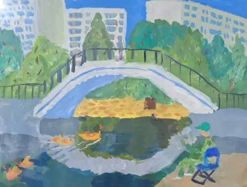 На работе изображена одна из достопримечательностей города Зеленоград - Михайловский пруд. На его берегах жители Зеленограда любят гулять и проводить свой досуг.
