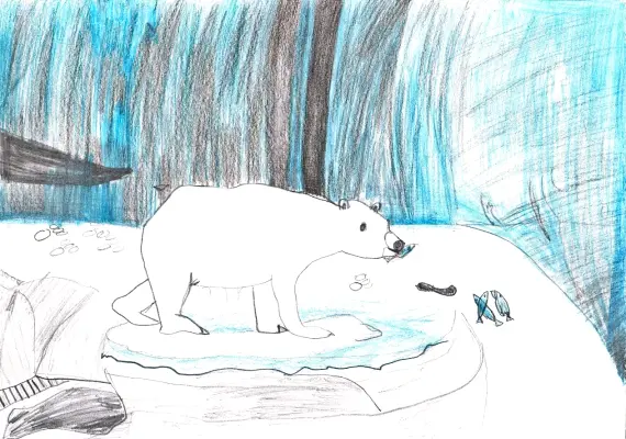 На рисунке изображён медведь Терпей в своём вольере. Он только что плотно позавтракал рыбой, искупался в прохладной воде и вышел на возвышение. На тёплом солнышке белый медведь хочет посидеть, чтобы согреться, обсохнуть и переварить еду