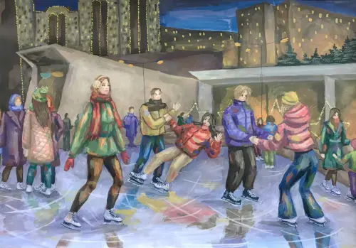 Рисунок зимнего катка на площади Юности в центре нашего Зеленограда. На заднем фоне виднеется кинотеатр «Электрон», одно из значимых зданий нашего города. Творческая работа в технике гуашь.
