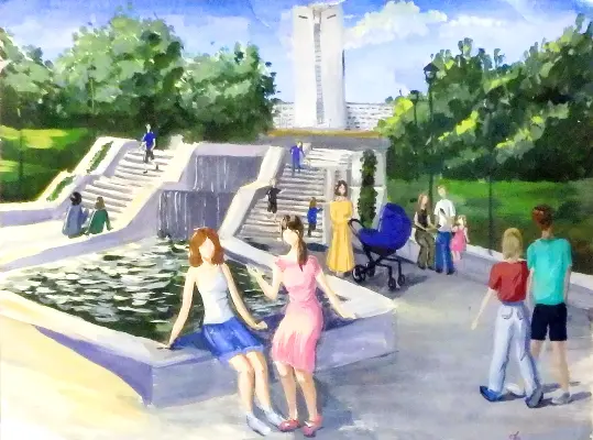 Летний отдых жителей Зеленограда в центральном парке нашего города у префектуры и ДК. Одна из главных достопримечательностей - фонтан. Жаркий летний день, пара людей присела отдохнуть в тени.
