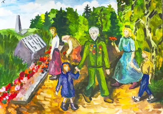 На рисунке люди кладут цветы на могилу Неизвестному солдату. Это памятник «Три штыка», расположенный рядом с нашим городом. Среди людей стоит ветеран. Он пришёл вспомнить о погибших товарищах и рассказать будущим поколениям о великом подвиге.