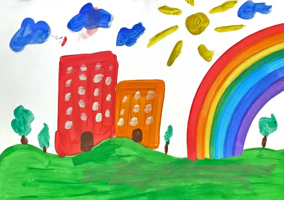 На этой картине изображены мой район и мой дом. Вчера я на улице видела красивую радугу, поэтому решила её нарисовать. Я люблю свой район. Мне нравится здесь гулять.