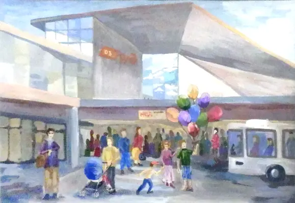 Здание МЦД в Зеленограде на станции Крюково. Вокруг много людей. Кто-то гуляет и любуется красотой. а кто-то спешит по своим делам. Ещё там стоит мальчик с большой связкой разноцветных воздушных шариков.