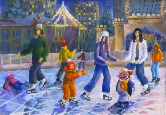 Жители катаются на коньках зимой. Много людей. Один малыш упал, возможно, он впервые на катке. Всё украшено праздничными огнями ночного зимнего города.