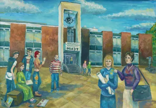 Художники на площади перед МИЭТ рисуют центральный вход. Вокруг ходят люди и светит солнце. Лето. Мимо проходят студенты, которые учатся в этом институте. Им интересно, что происходит.
