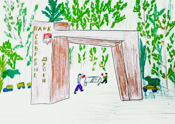 Недалеко от моего дома есть парк. Называется он «Северные Дубки». Это самая большая зелёная территория моего района. Конечно, там не хватает водоёма, как в парке «Ангарские пруды», но там хорошо гулять под тенью деревьев, качаться на подвесных качелях, играть в теннис и волейбол. Многие там занимаются спортом, есть немного тренажёров, но удобнее всего заниматься скандинавской ходьбой и пробежками, также кататься на велосипедах. Зимой можно ходить на лыжах и кататься на катке с искусственным льдом. Есть тёплая раздевалка, автомат с напитками. Визитная карточка нашего парка - входные ворота. Я поэтому их нарисовала. В парке много лавочек, где удобно в уединении читать книгу на свежем воздухе. Также есть детская площадка, куда приходят мамы с детьми. Хорошо, когда есть кусочек природы среди многоэтажек нашего города.