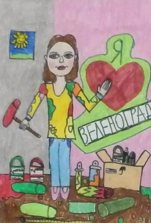 Девочка нарисовала на стене рисунок о своей любви к Зеленограду. Она любит жить в этом городе. Вокруг лежат банки с краской, баллончики, в у неё в руках валик, чтобы красить стены.