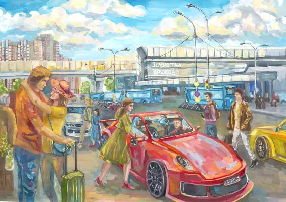 Станция Крюково. Вокруг ходят много людей: пассажиров, кто-то кого-то встречает, кто-то сам отправляется в путь. Женщина садится в красную машину, её встречает муж после работы.
