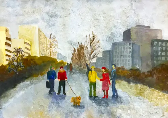 На фоне городского пейзажа на работе изображены жители города. В данной работе автор постарался передать колоритность своего города, его улиц и строений.