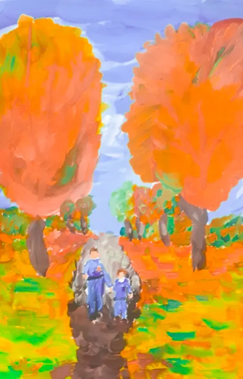Я люблю гулять с папой в парке. Там очень красиво в любую погоду, особенно осенью, когда все деревья «золотые». Потому я нарисовал прогулку с папой в Терлецком парке.