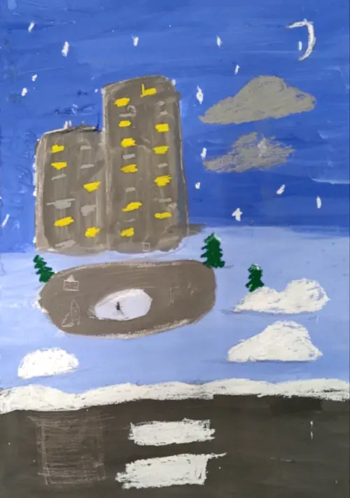 Работа написана гуашью. Мне хотелось передать лирическое настроение, предзакатный пейзаж района, передать чувство тихой радости и уюта. В окнах горит тёплый жёлтый свет. Вечереет!