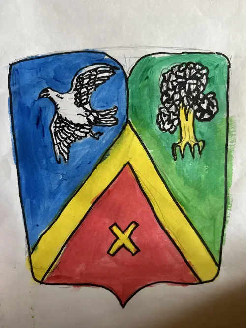 Живу в районе Ховрино. Я люблю свой район. Тут много парков, отличных детских площадок. Недавно на одной из них я нашла пластиковый герб района. Он мне так понравился, что я решила его нарисовать.