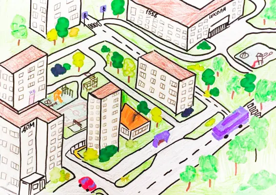 На этом замечательном детском рисунке перед нами открывается уютный уголок родного района. На рисунке изображено здание школы с большими окнами, в которых, кажется, отражается солнечный свет. Рядом с школой раскинулся зелёный двор, где растут высокие деревья с пышной листвой. Под их ветвями можно укрыться от полуденного зноя и поиграть с друзьями на переменке.