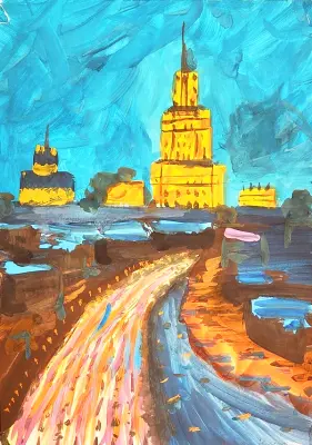 Застывший, монументальный силуэт московской высотки доминирует над горизонтом. Фон рисунка нарочито размыт, лишён конкретных деталей. Лишь лёгкие намеки на окружающую застройку и мягкие очертания неба. Это сделано намеренно, чтобы акцентировать внимание на главном объекте – высотке, которая, словно маяк, возвышается над городом, символизируя его мощь, амбиции и стремление к будущему.