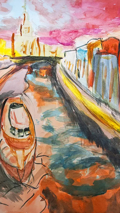 Небрежно, но с любовью выведены линии, передающие ощущения летнего дня. Катер, чуть кренясь, рассекает волны, оставляя за собой пенный след. Сзади, как сказочный исполин, высится сталинская высотка на Котельнической набережной. Её шпиль, кажется, пронзает самое небо. Вода, изображенная неровными мазками, словно живая, играет солнечными бликами. Берега, наоборот, размыты, как воспоминания, ускользающие от взгляда. Лишь угадываются очертания деревьев и строений. Возможно, это ощущение скорости, передаваемое ребенком, завороженным движением катера.