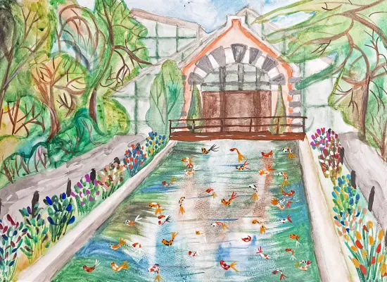 Это самый старый и ухоженный ботанический сад России, основанный ещё Петром Великим. При входе есть небольшой прудик, он называется Зеркальным, потому что в нём отражается здание оранжереи. А ещё чуть в тени плавают очень красивые рыбы.