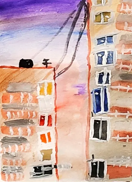 Я решил нарисовать многоэтажные дома. Это удивительно, как много людей может жить в них. В доме есть различные технические сооружения. Лифтовые шахты, пожарная лестница, установлено на крышах разное оборудование: антенны для телевизора, провода. Я люблю наблюдать за окнами, как они меняются в разное время дня. Мне нравится, когда солнце освещает дома в вечернее время.