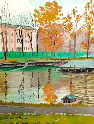 Этот прудик располагается прямо напротив школы. Осенью там особенно красиво: жёлтая листва на деревьях отражается на поверхности воды, подрагивая мелкой рябью от дуновения осеннего ветра. Иногда на этот прудик прилетают уточки, и их можно покормить хлебом.