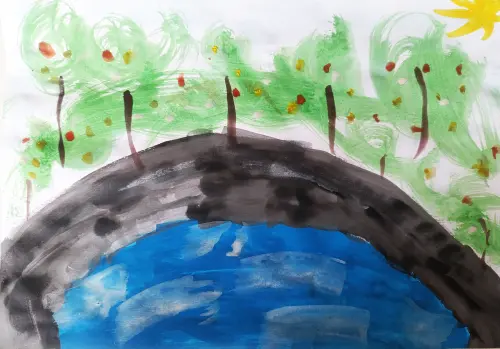 Пруд на самом краю леса. Там гуляют с собаками, ловят рыбу, взрослые бегают вокруг него по дорожке. На пруду живут утки и лягушки. Я очень люблю там гулять.