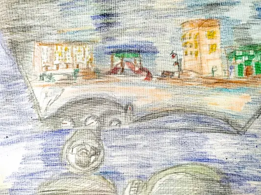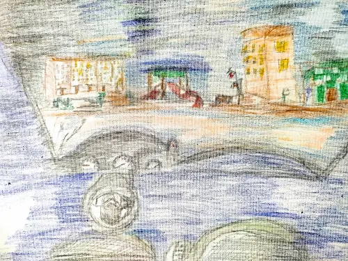 Здравствуйте, уважаемые члены жюри! Меня зовут Григорий Столяров, ученик 2 «А» билингвального класса, школы №1571. Дополнительно занимаюсь в кружках рисования, английским языком онлайн с репетитором и ОФП. Так как мне нравится куда-нибудь ездить с папой, я изобразил свой двор через стекло автомобиля.