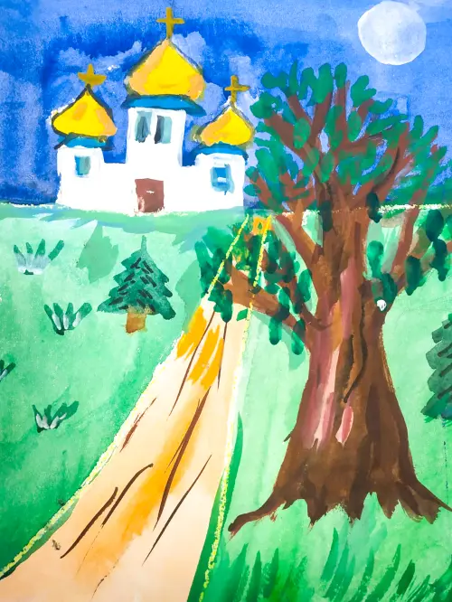 У нас в Алтуфьевском районе есть прекрасный бело-голубой храм. Я хожу туда в воскресную школу. Вечером Храм Торжества Православия в Алтуфьево смотрится очень красиво, в свете луны сияют купола