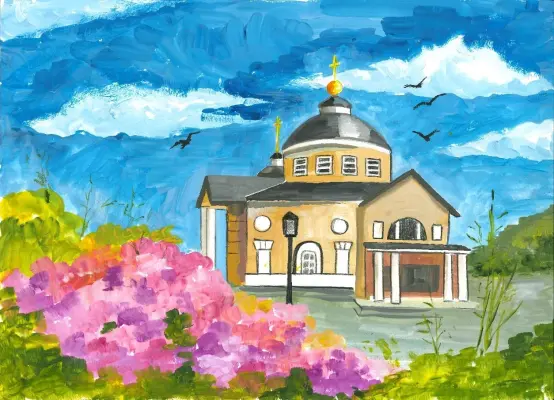 Моя работа посвящена моему любимому храму, который мы посещаем всей семьёй по воскресеньям и праздничным дням. Рядом с храмом есть небольшая детская площадка, мы любим там играть с моей младшей сестрёнкой Настей.