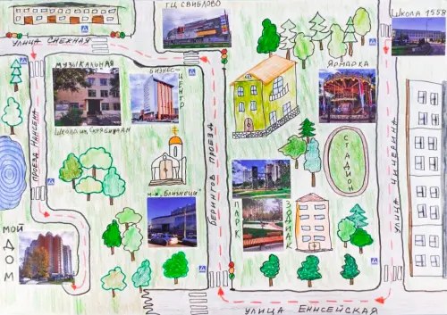 Я взяла настоящие фотографии мест, мимо которых прохожу, и аккуратно наклеила их вдоль дорожки. Мне очень понравилось работать над этим проектом! Я научилась аккуратно вырезать фотографии, красиво располагать их на листе и даже подписывать важные места. Теперь мой рисунок не просто картинка — он как настоящий путеводитель по моей дороге домой.