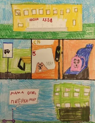 Привет! Я — Арина, и это мой рисунок про то, как я еду домой из школы на автобусе. Вот я стою на остановке. Я всегда аккуратно стою подальше от дороги, как меня учила мама. А вот самый интересный момент — я нарисовала, как плачу за проезд! Это моя транспортная карта, я сама прикладываю её к терминалу. Потом я сажусь на сиденье и ставлю рюкзак рядом. Обычно я смотрю в окно и считаю остановки. А в конце рисунка — наш дом!