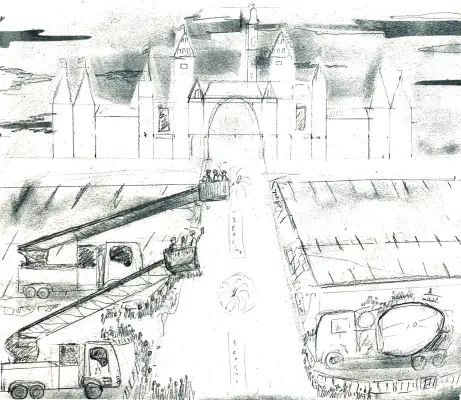 На рисунке изображён процесс строительства моего любимого парка - «Остров Мечты». Я очень ждал, когда он откроется, и я смогу покататься на аттракционах.