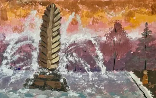Меня зовут Саша, и я хочу рассказать про свой рисунок. Это знаменитый фонтан «Колос» на ВДНХ — огромный и сверкающий! Видите эти высокие струи воды? Я старался нарисовать их так, будто они действительно брызгаются! Это мой любимый фонтан, я люблю приходить сюда с родителями. А теперь он есть и на моём рисунке — можно любоваться каждый день!