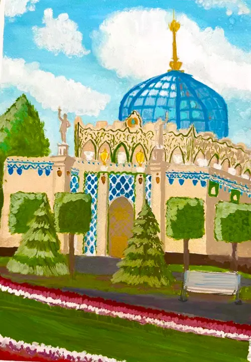 Я нарисовала павильон «Казахстан» - он такой необычный и сразу бросается в глаза среди других зданий! Смотрите, какая у него интересная форма: высокие белые колонны и золотая верхушка, похожая на красивый восточный головной убор. Мне очень нравится рассматривать все узоры и орнаменты на стенах. В моём рисунке я постаралась повторить эти замысловатые казахские узоры — они такие кружевные и нарядные!