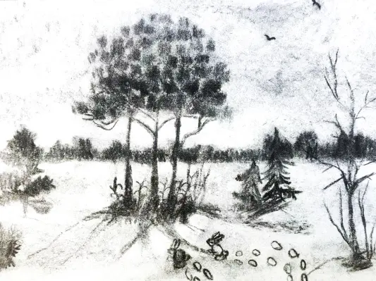 На рисунке изображен парк «Коломенское» в зимнее время года. Всё покрыто снегом, можно даже увидеть следы разных животных. Вот зайцы вышли поискать еду