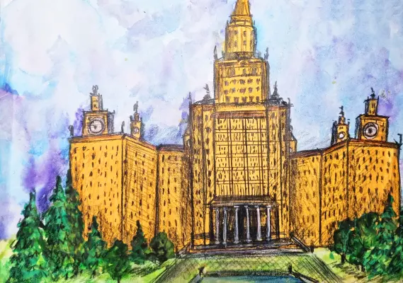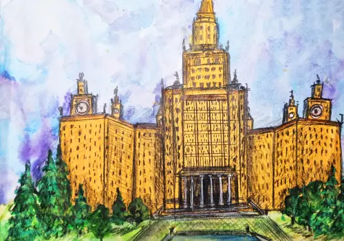 На рисунке изображено красивое и величественное здание Москвы - МГУ, покоряющее жителей и гостей столицы не только своими размерами и архитектурой, но и своей многовековой историей. Каждый житель нашей страны мечтает учиться в этом университете или хотя бы побывать за его могущественными стенами: пройтись по его длинным коридорам, заглянуть хотя бы одним глазком за старинные двери, хранящие за собой многочисленные тайны.