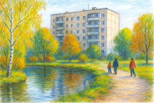 На рисунке я изобразил наш район Бирюлево Восточное. В центре стоит наш дом, который выглядит довольно однообразно, но для меня это место, где я вырос. Вокруг дома растут высокие деревья, которые придают атмосфере больше жизни и цвета. На переднем плане я нарисовал пруд. Вода в нём прозрачная и спокойная, отражающая небо и зелень деревьев. Я люблю приходить сюда с родителями, особенно в осенние теплые дни - это наш любимый сезон года. Мы часто гуляем вдоль берега, и я вижу, как они улыбаются. Это делает меня счастливым.