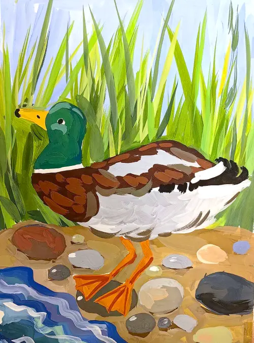 Вот и наступило лето! На камнях сверкает утренняя роса. Вокруг – синее-синее озеро. Зелень травы прикасается к небесному своду. Тёплые лучи солнца согревают пёрышки моей очаровательной уточки. Вот-вот и она отправится в путешествие по водной глади.