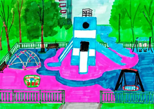 Я решил выбрать для рисунка детскую площадку с красивым маяком рядом с нашим домом, куда мы каждый день летом любим ходить гулять. Больше всего нам нравятся горки разных уровней, которые сделаны на маяке.
