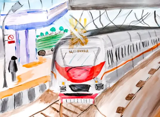 На рисунке изображена электричка на станции МЦД Щербинка. Построен новый красивый переход с эскалаторами, поэтому захотелось нарисовать поезд, идущий в сторону центра Москвы.