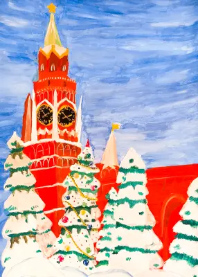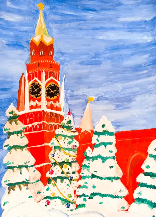 На рисунке изображен Московский Кремль. Мы очень любим там гулять, особенно в новогодние каникулы, поэтому несмотря на то, что это не мой район проживания, очень хотелось нарисовать именно это место.