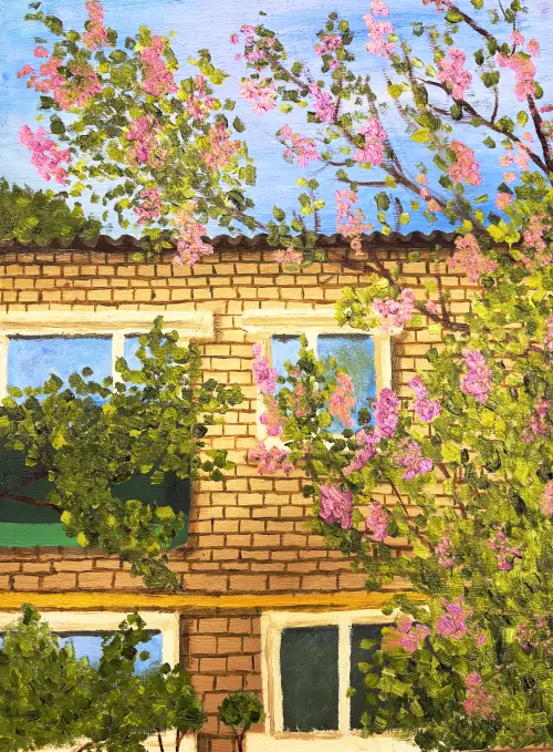 Это дом, похожий на тот, в котором я живу. Перед ним в мае цветёт прекрасная сирень, и я часто смотрю в окно и рисую натюрморты с этими цветами. И у меня дома сирень цветёт круглый год!