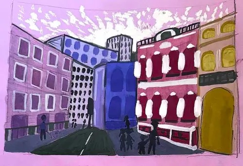 Я нарисовала уютный район. Здесь очень красиво — разноцветные дома: одни жёлтые, другие голубые или красные, а некоторые даже с яркими ставнями.