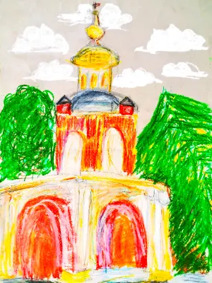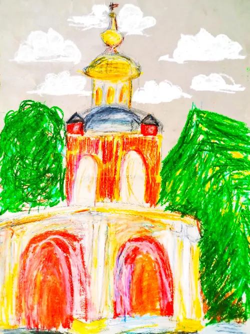 Здесь я изобразила часть ансамбля усадьбы Алтуфьево, а именно церковь Воздвижения Креста Господня в Алтуфьеве. Рядом с этим храмом родилась и жила в детстве моя мама, и мы часто ездим сюда погулять и порисовать.