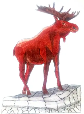 Меня очень вдохновила эта скульптура, поэтому я её и изобразила на этом рисунке. Когда стоишь рядом, этот лось такой большой и мужественный! Жалко, что на рисунке нельзя этого передать в полном объёме.