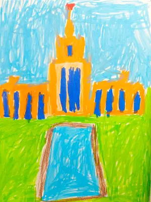 На рисунке изображён МГУ. Очень люблю это место. Мы с мамой садимся на автобус, и доезжаем прямо до главного корпуса. Оттуда идем на смотровую площадку, а оттуда спускаемся по канатной дороге до Лужников.