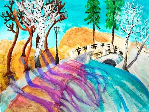 Я нарисовала мост в Царицыно, как я его вижу ранней весной. Это место, где я часто гуляю, и картина точно передает то ощущение света и воздуха, которое появляется именно в это время года. Голые ветви деревьев на переднем плане — это те самые деревья, мимо которых я прохожу каждый день. Их длинные, тонкие тени, вытянутые солнцем, как раз такие, какие я наблюдаю на земле после обеда. Мост, конечно, центральная фигура всего изображения, и это тот самый мост, по которому я часто перехожу, направляясь в парк. Его перила, немного потемневшие от времени, и слегка потрескавшаяся каменная кладка — всё это очень знакомо. За мостом видны знакомые мне очертания холмов, которые окружают наш район. На них растут те же ели, что и в нашем лесочке за домом. Даже голубое небо, кажется, то самое, что я вижу из своего окна каждое утро. Этот сине-голубой оттенок воды под мостом — это та самая вода, которая весной так ярко отражает небо. В целом, это — мой район, запечатлённый ранней весной.