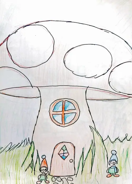 У нас во дворе есть детская площадка, и там находится такое красивое украшение на клумбе. Это красивый грибок, и рядом стоят забавные фигурки маленьких гномиков.