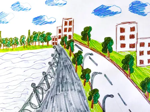 На рисунке изображена уютная набережная, по которой я люблю гулять всей семьей. На набережной очень красиво, с неё можно наблюдать за игрой солнечных лучей на воде
