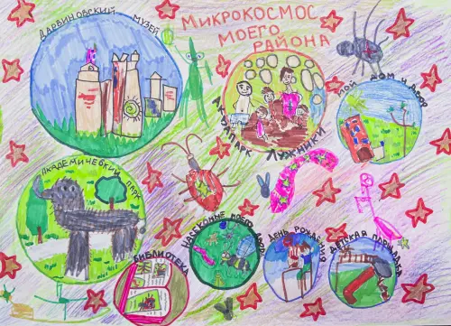 Паша нарисовал свои любимые места у дома со своими увлечениями: насекомые, динозавры, космос, книги. Это Дарвиновский музей, Академический парк, библиотека, аквапарк «Лужники», а также дом и двор с детской площадкой. Это его микромир детства, проходящего на стыке Гагаринского, Академического и Ломоносовского районов ЮЗАО города Москвы